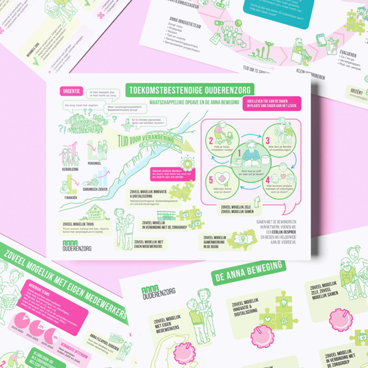 Hoe vertaal je die focus naar een duidelijk verhaal voor iedereen die betrokken is bij Anna Ouderenzorg? Een praatplaat blijkt de oplossing. Een visuele weergave van de focus, die we als hulpmiddel kunnen gebruiken bij het goede gesprek. De praatplaat wordt samen met de managers, ondersteunende diensten en directie ontwikkeld. Zo werd het een verhaal van ons allemaal. En vormt de praatplaat meteen de basis voor een nieuwe uitstraling, die past bij de Anna Beweging. In dezelfde stijl komen er verdiepende praatplaten over bijvoorbeeld innovatie en HR.