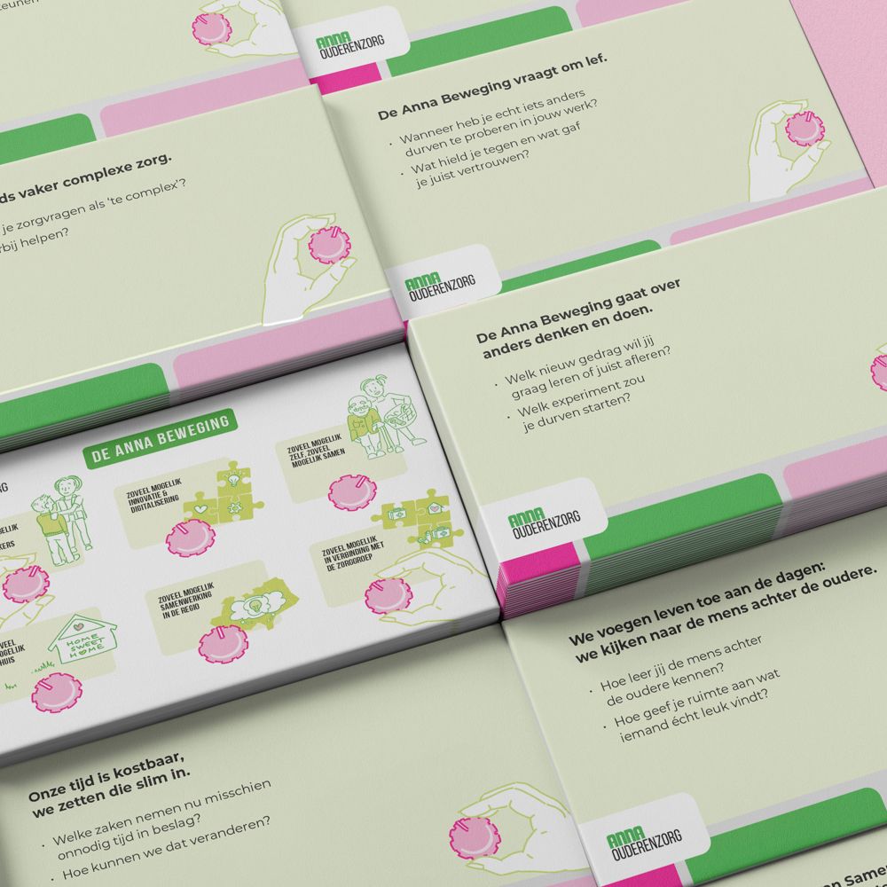 De verschillende praatplaten vormen de basis voor dialoogsessies die plaatsvinden in alle huizen. Daarin gaan zorgprofessionals, teamcoördinatoren, teammanagers en directie in gesprek. Ook zijn er bijeenkomsten met bewoners en mantelzorgers. In iedere sessie staat het verhaal van De Anna Beweging centraal. Iedereen kan vragen stellen, zijn mening geven en in gesprek gaan. Na een aantal dialoogsessies maken we dialoogsessiekaartjes die het makkelijker maken om het goede gesprek te voeren. Met daarop concrete dilemma’s passend bij de beweging. Kaartjes die ook buiten de dialoogsessies kunnen worden gebruikt.